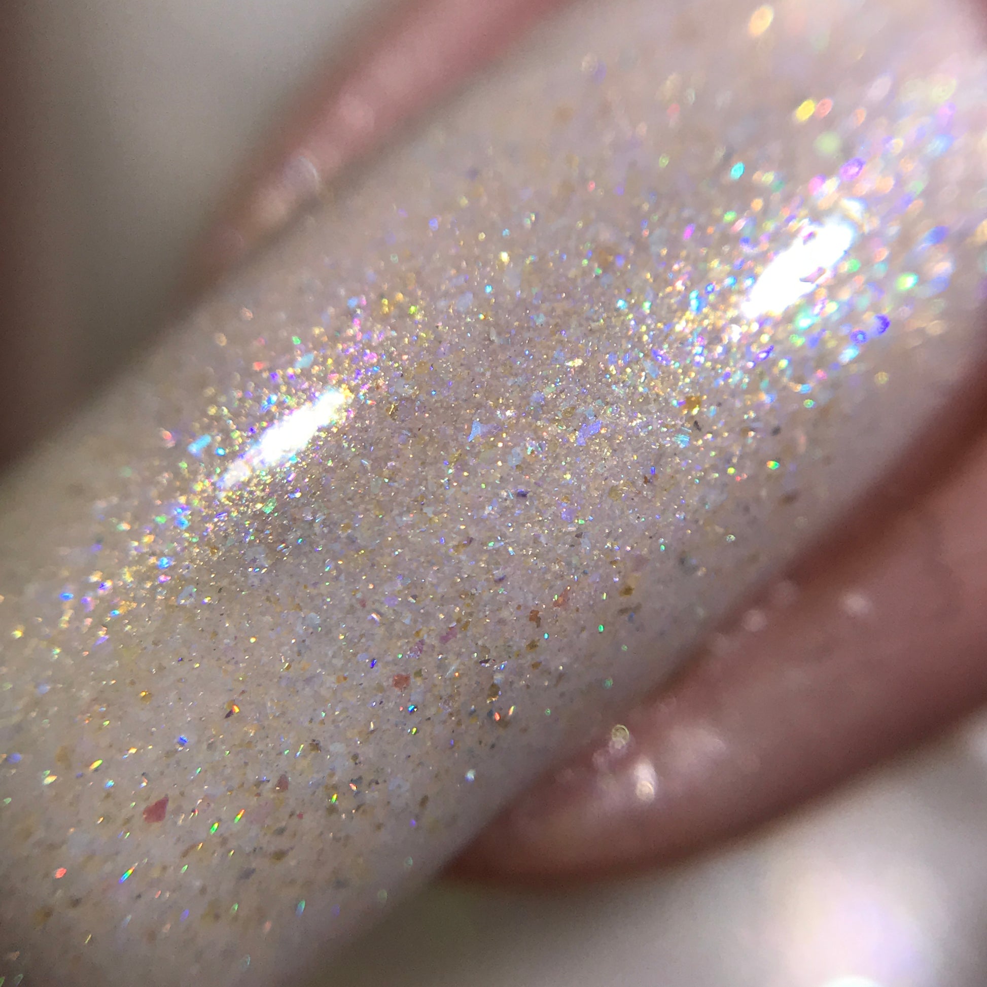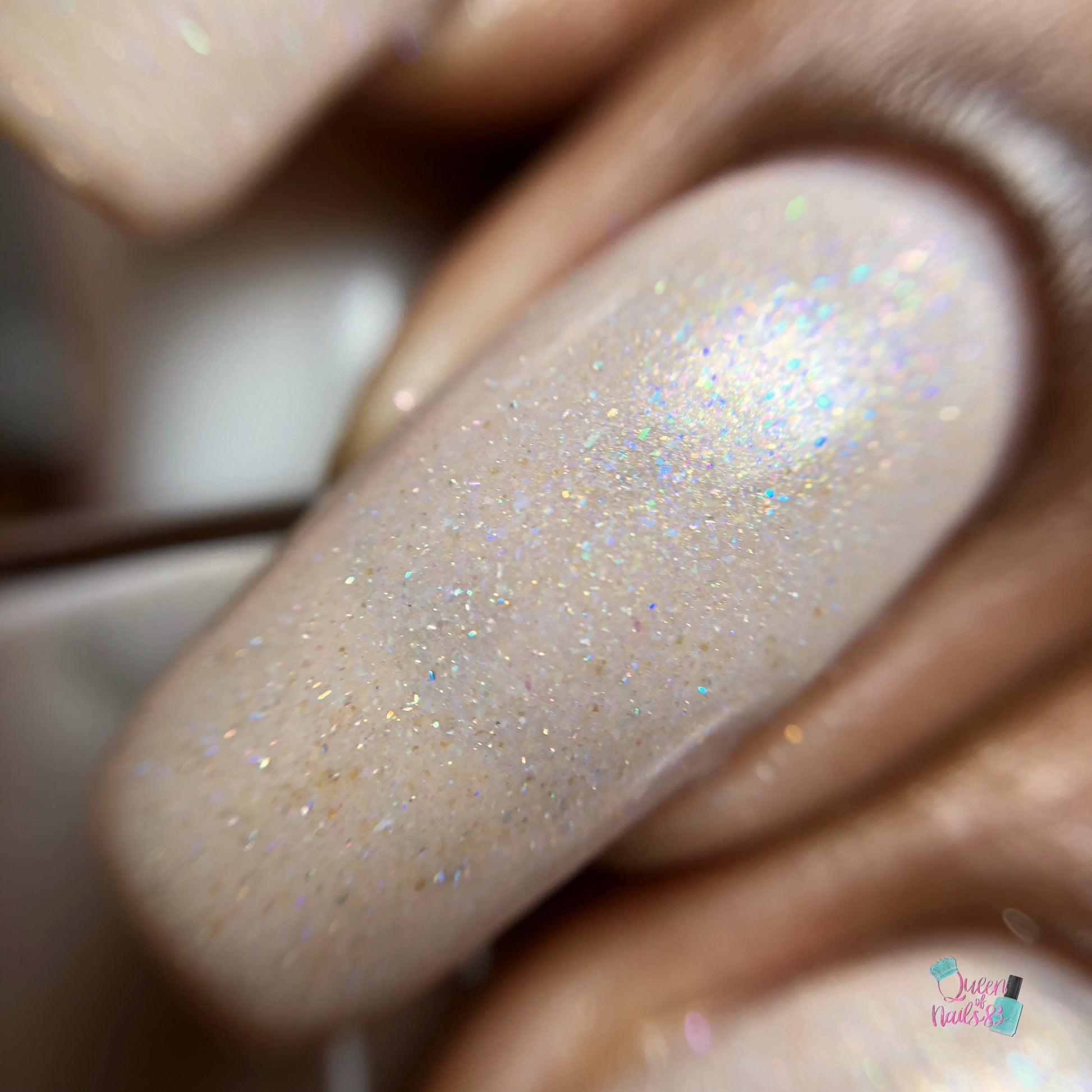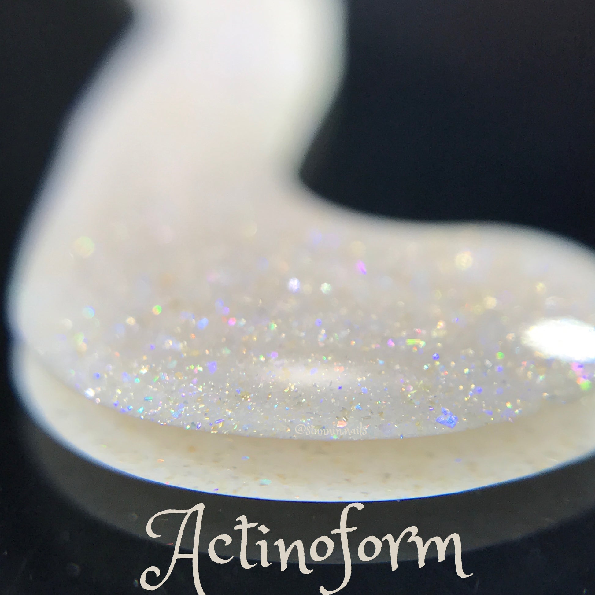 Actinoform.103 is a cream nail polish with rainbow holographic sparkle. It glimmers with shades of green, blue and purple flecks for a subtle shimmer. An actinoform or actiniform cloud is a collection of marine low clouds that takes a distinct shape. They are named after the Greek word for "ray" due to their radial structure.