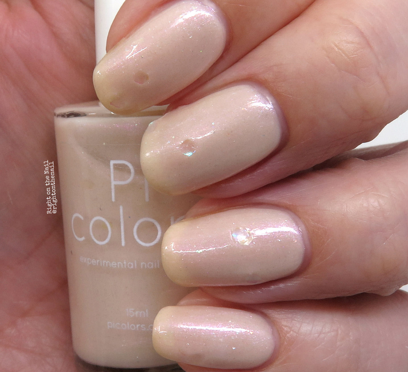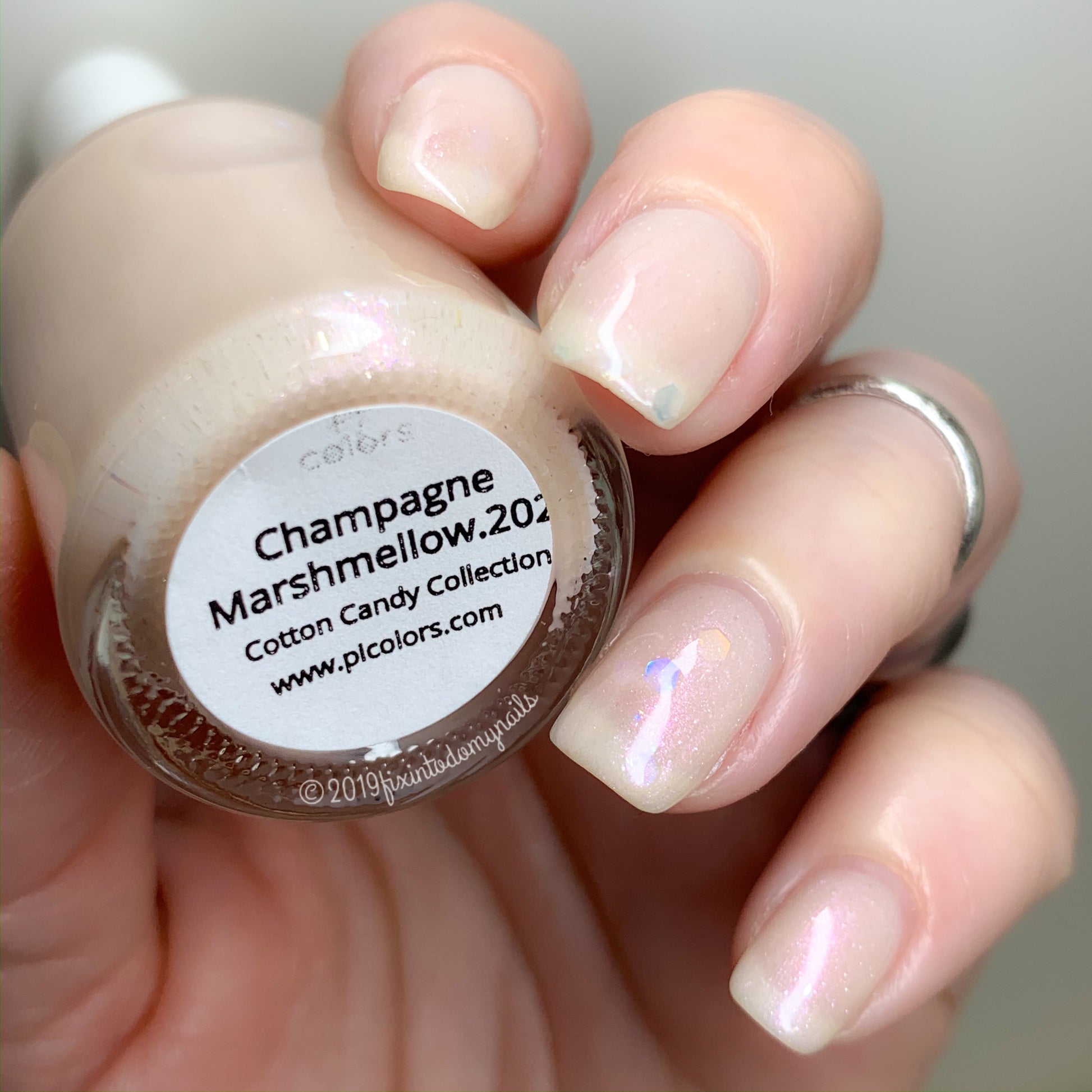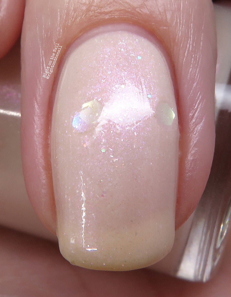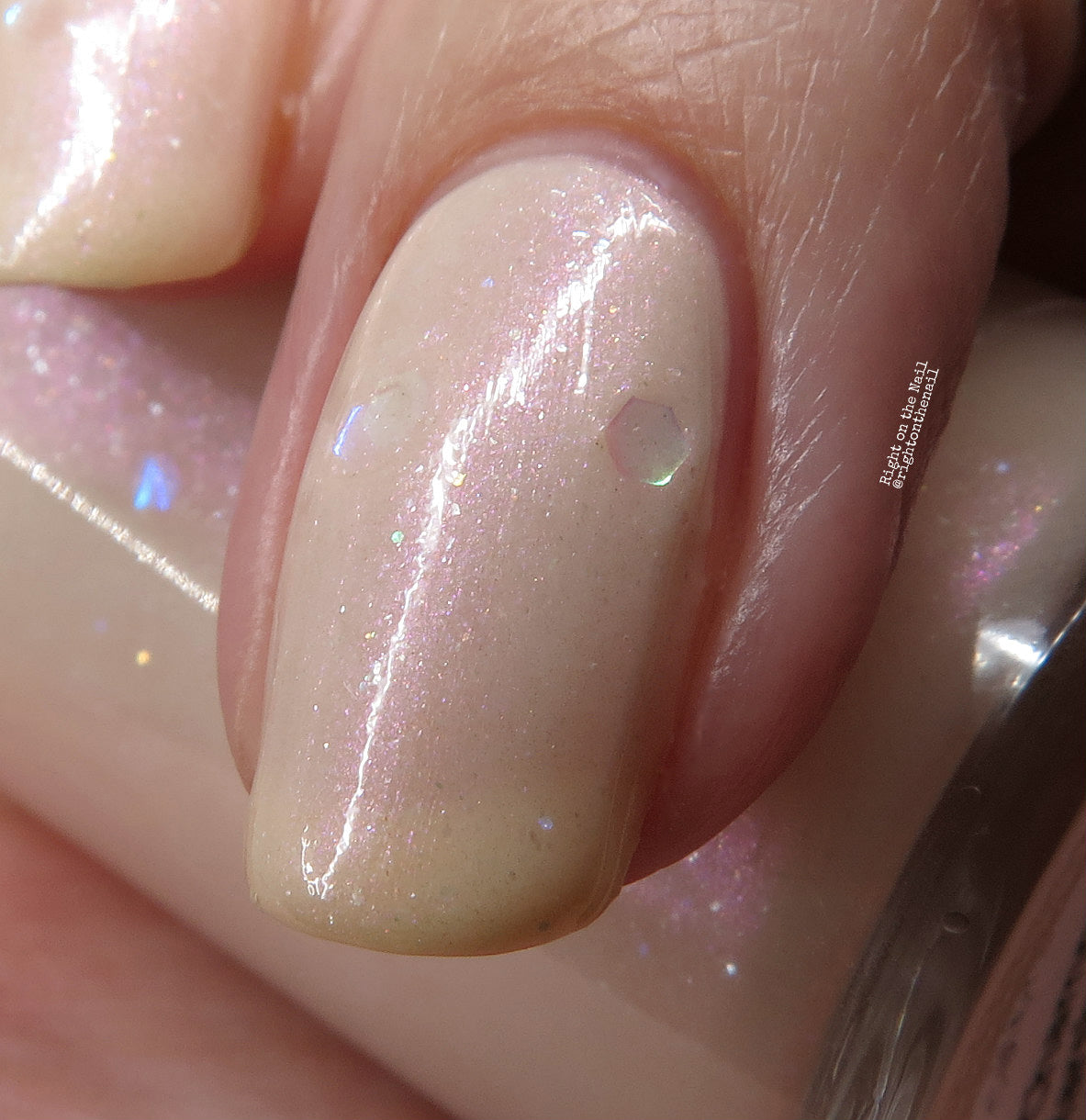 Champagne Marshmallow.202 is a pale cream pink with iridescent hex glitters and red violet shimmery overlay.