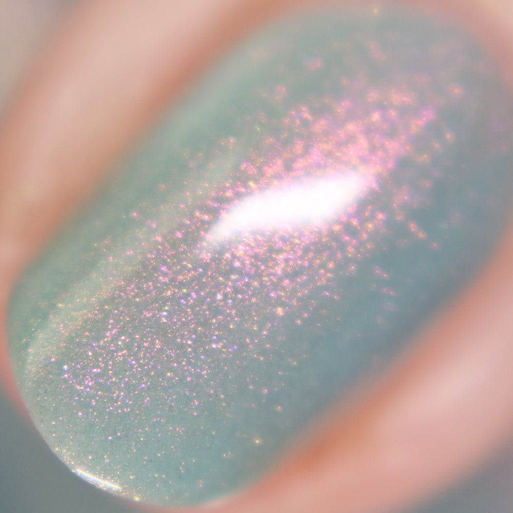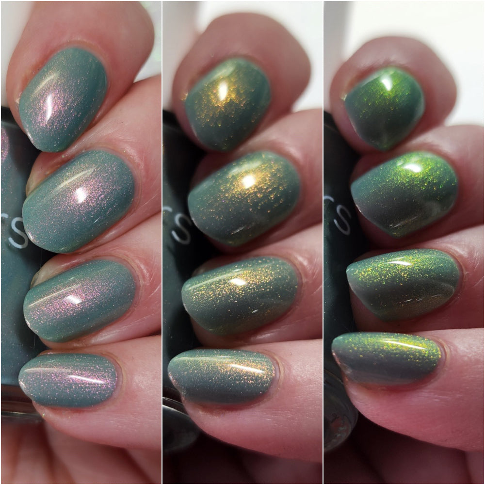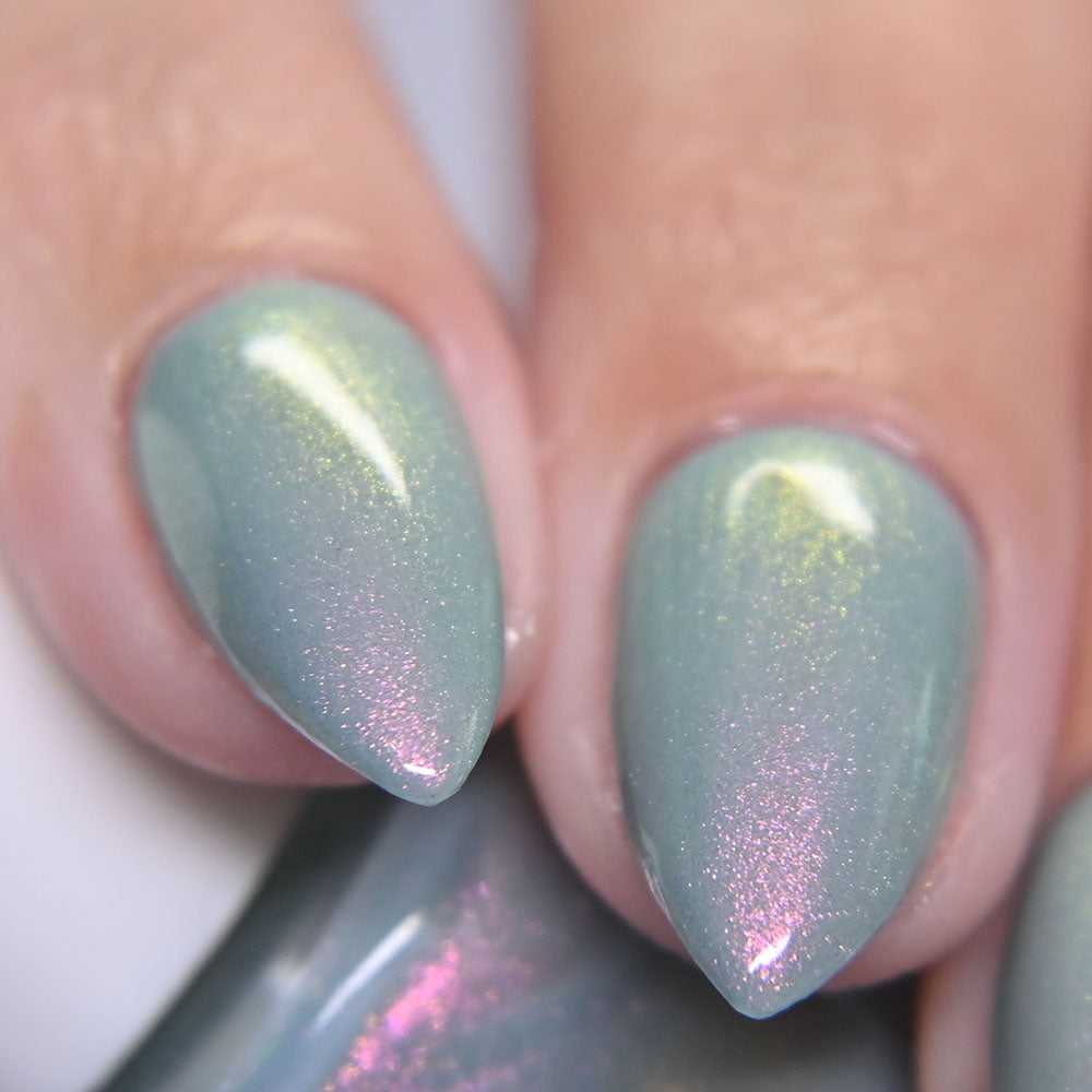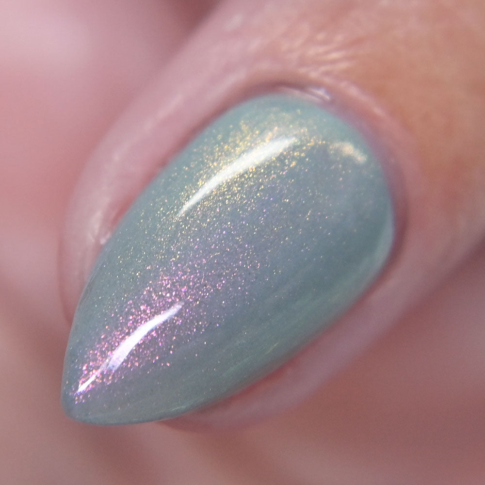 This is a pale gray green nail polish with grey undertone and pink to gold to green shimmer. Inspired by the orchid mantis for the Polish Pickup "cute but deadly" theme.