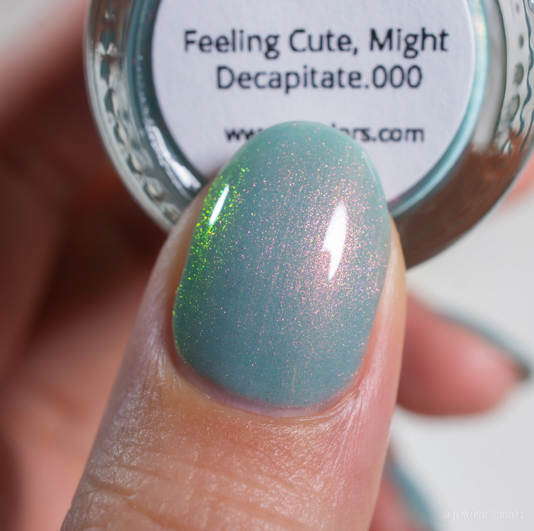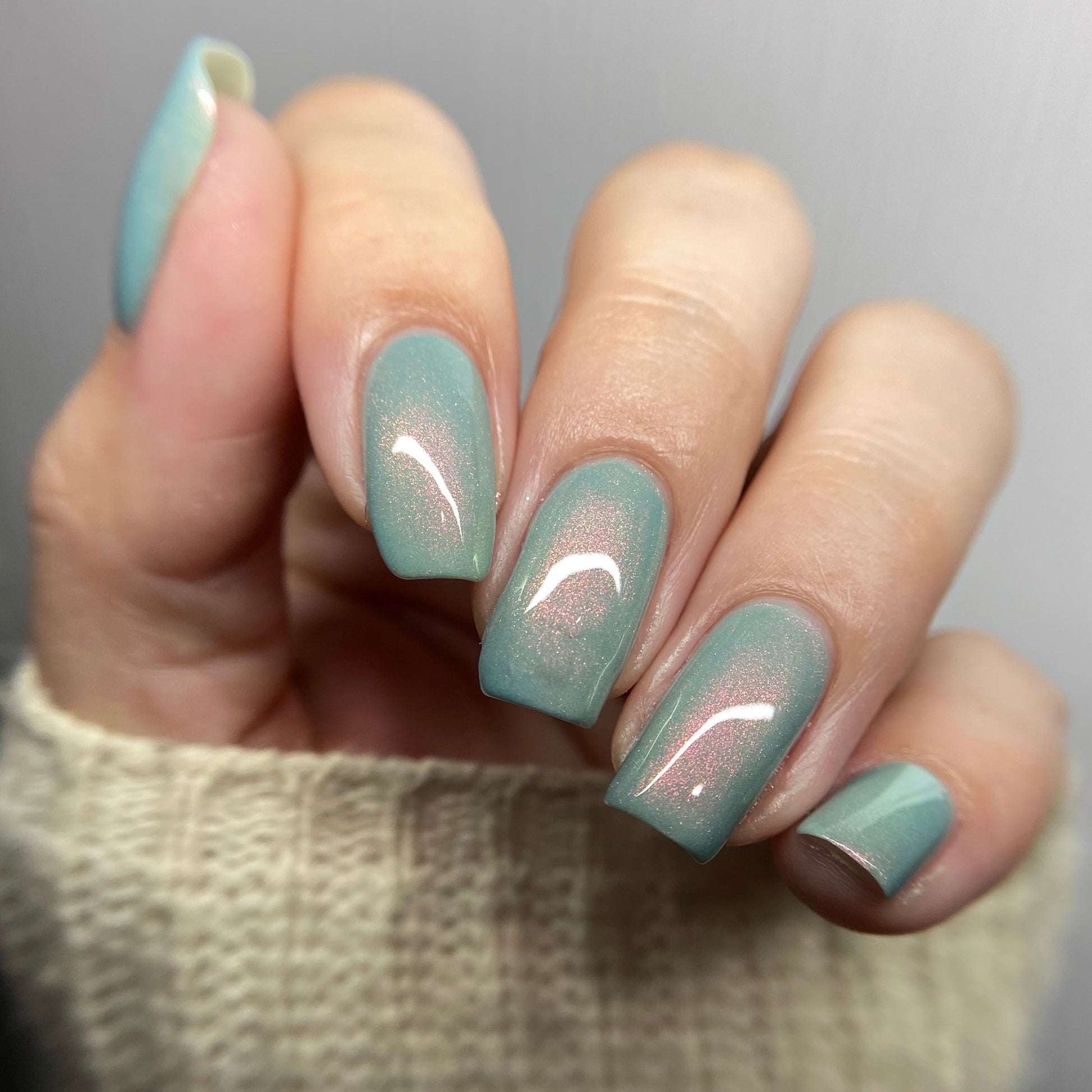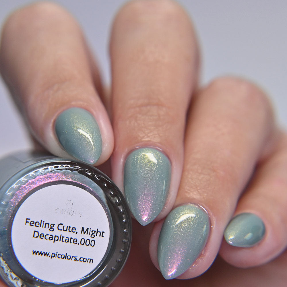 This is a pale gray green nail polish with grey undertone and pink to gold to green shimmer. Inspired by the orchid mantis for the Polish Pickup "cute but deadly" theme.