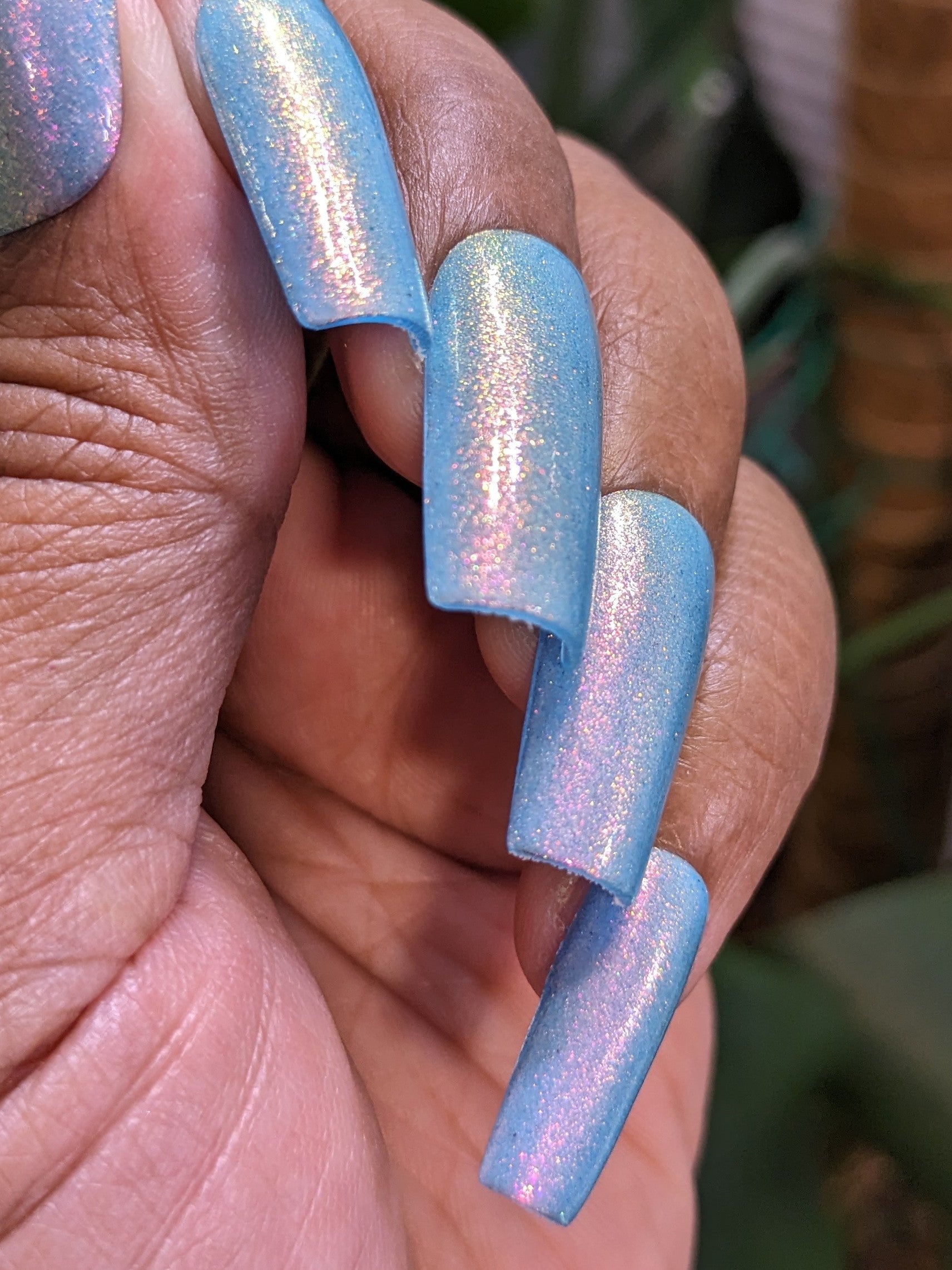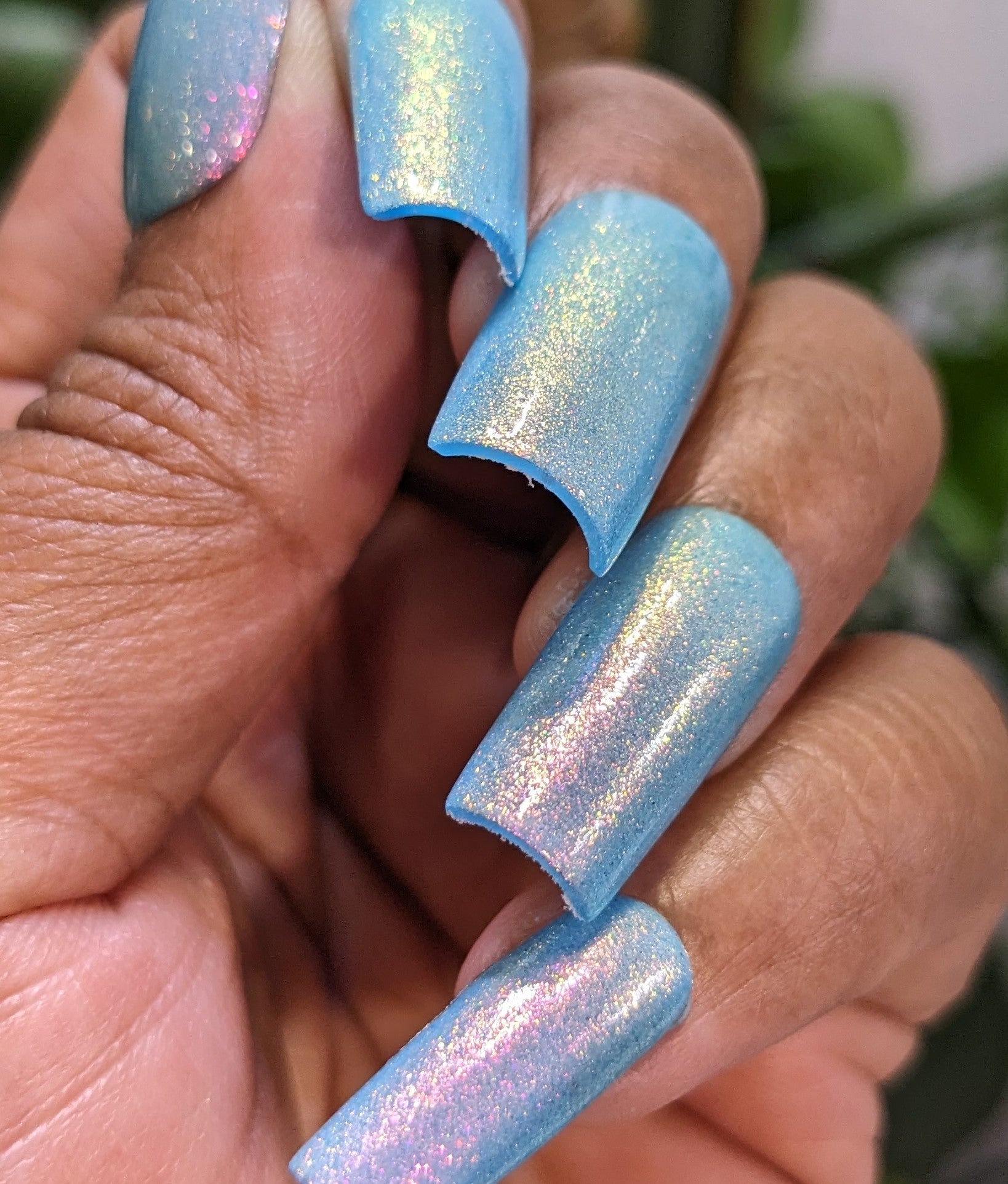 Fire Pink Rainbow.000 pale blue base with a very strong colorshifting gold, pink, green shimmer.