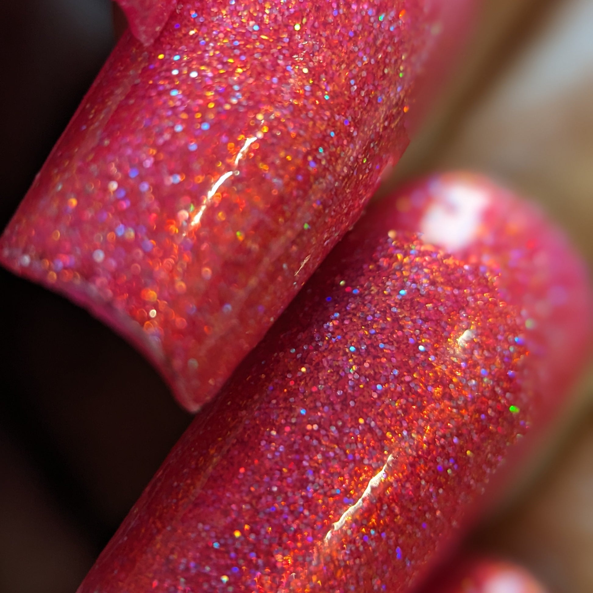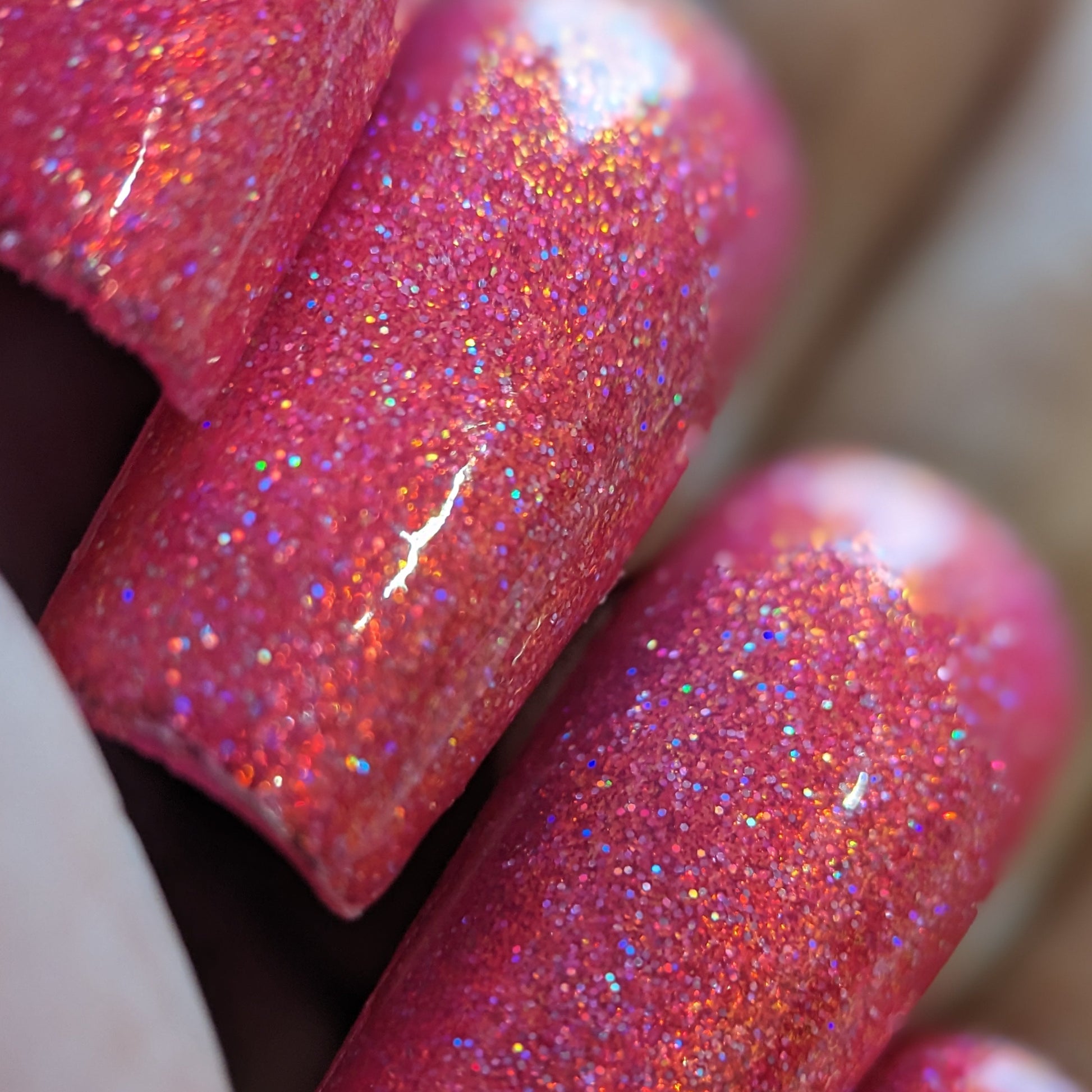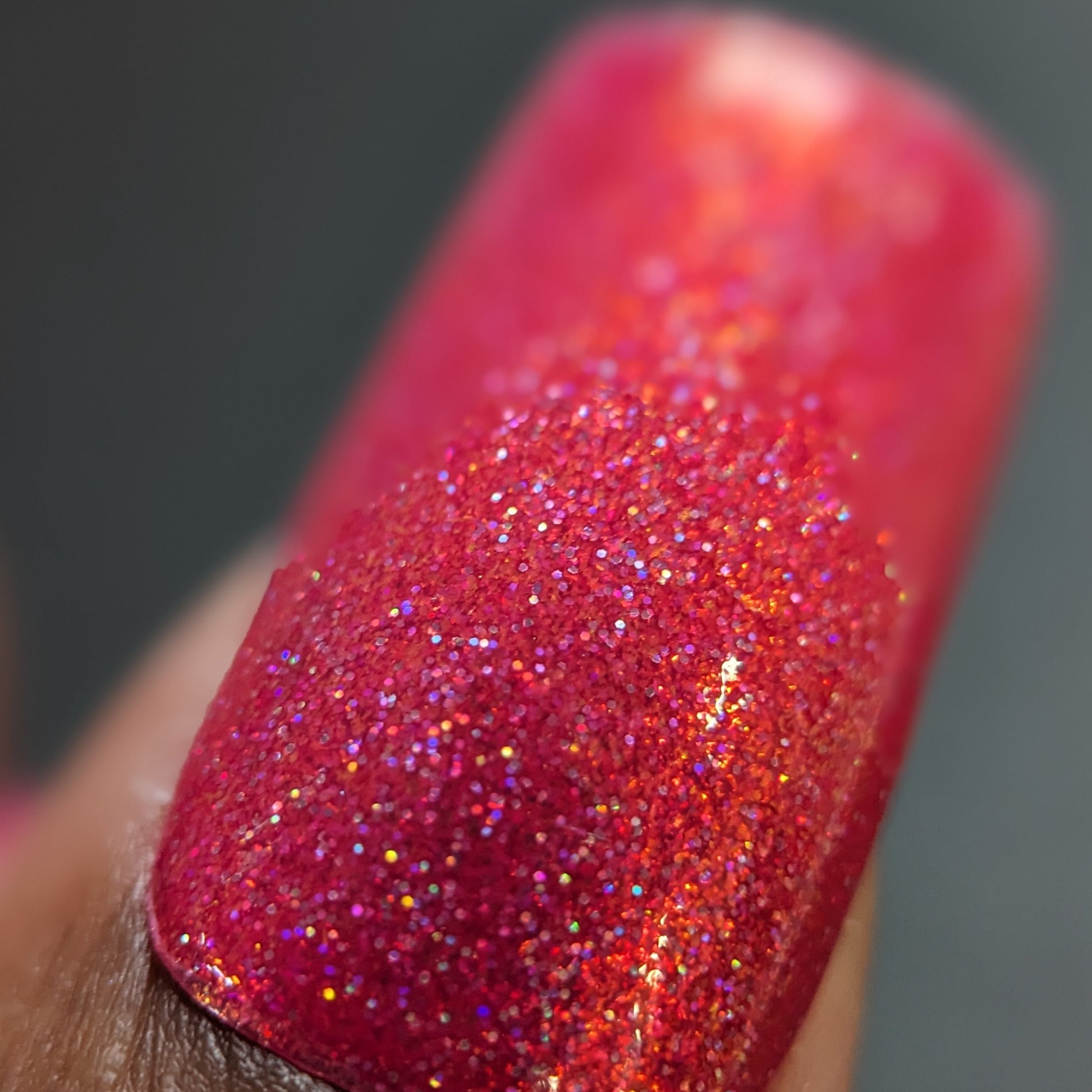 Glitter Pink Parade.152 is a hot pink nail polish filled with holographic silver glitter that sparkles in the light. A slight golden sheen can be seen as you shift your nails in the light.