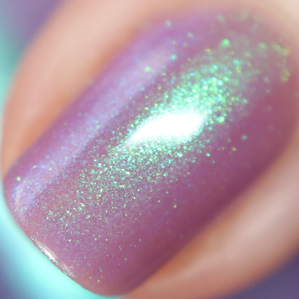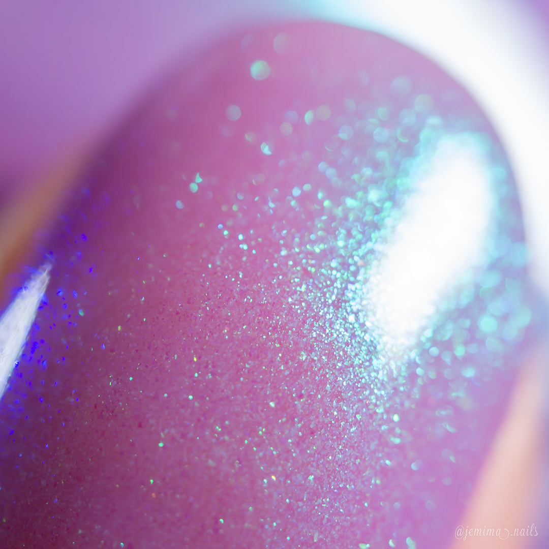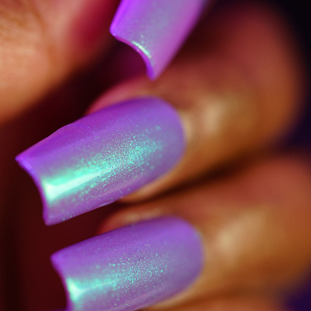 This polish is a pale lilac purple nail polish with strong blue and cyan shimmer.
